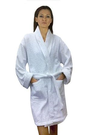 True to form, this 36" long solid white terry loop bathrobe by Aegean Apparel epitomizes basic style and functionality. Made from 100% Turkish cotton terry loop and features like a turnback shawl collar, two front patch pockets, a self adjustable tie front belt, premium softness and unbeatable absorbency, you'll never want to take it off! One Size Fits Most is also a great gift giving item because the robe fits a range of sizes.
