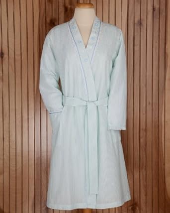 When evening rolls around, keep things cool and comfortable with this Seersucker Robe. Made by Miss Elaine of supremely soft cotton-polyester seersucker, this summery wrap robe features eyelet trim details on the patch pockets, and delicate ruffle trim at its three-quarter length sleeves. Simple embroidery rounds out the beautiful, flattering style of this lovely floral robe. Machine wash and dry. Colors: Pink. Mint. * Cotton/Polyester * Machine wash warm. Gentle cycle. Tumble dry low. * Imported * Colors: Mint, Pink * Sizes: S,M,L,XL * Approx. Length (37'')